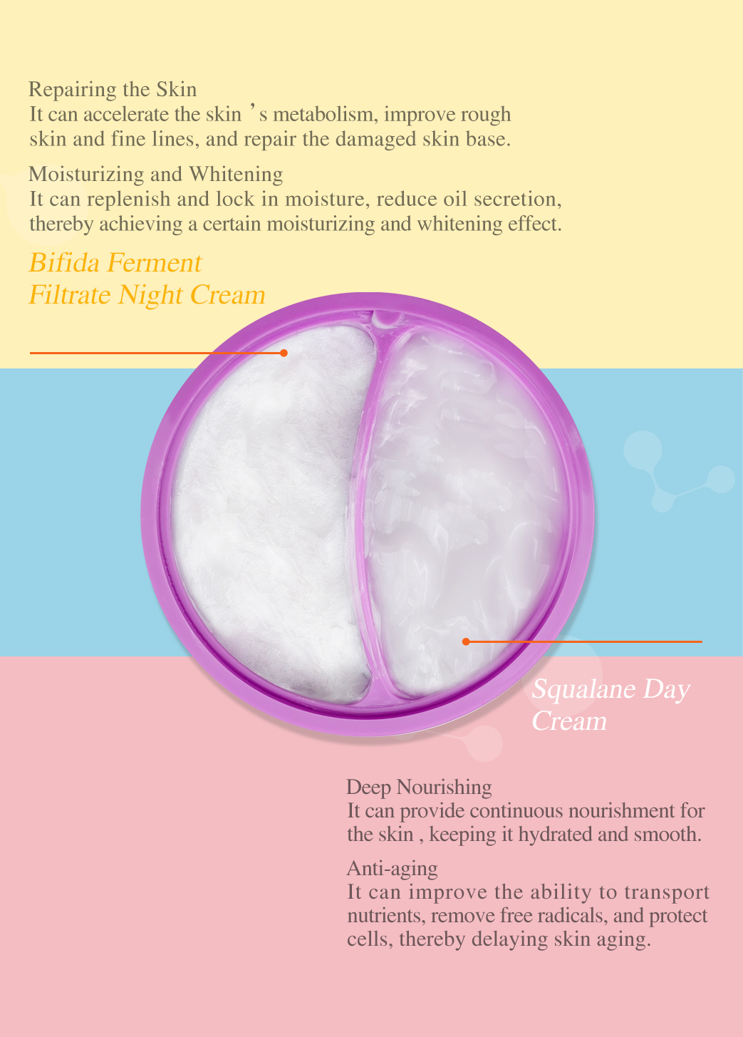 Day cream focus on hydrating and moisturizing, while night cream focus on repairing and lightening.